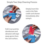 - Simply slide your card in and out of the card slot and it will be evenly coated with a 70% alcohol solution that cleans your card.