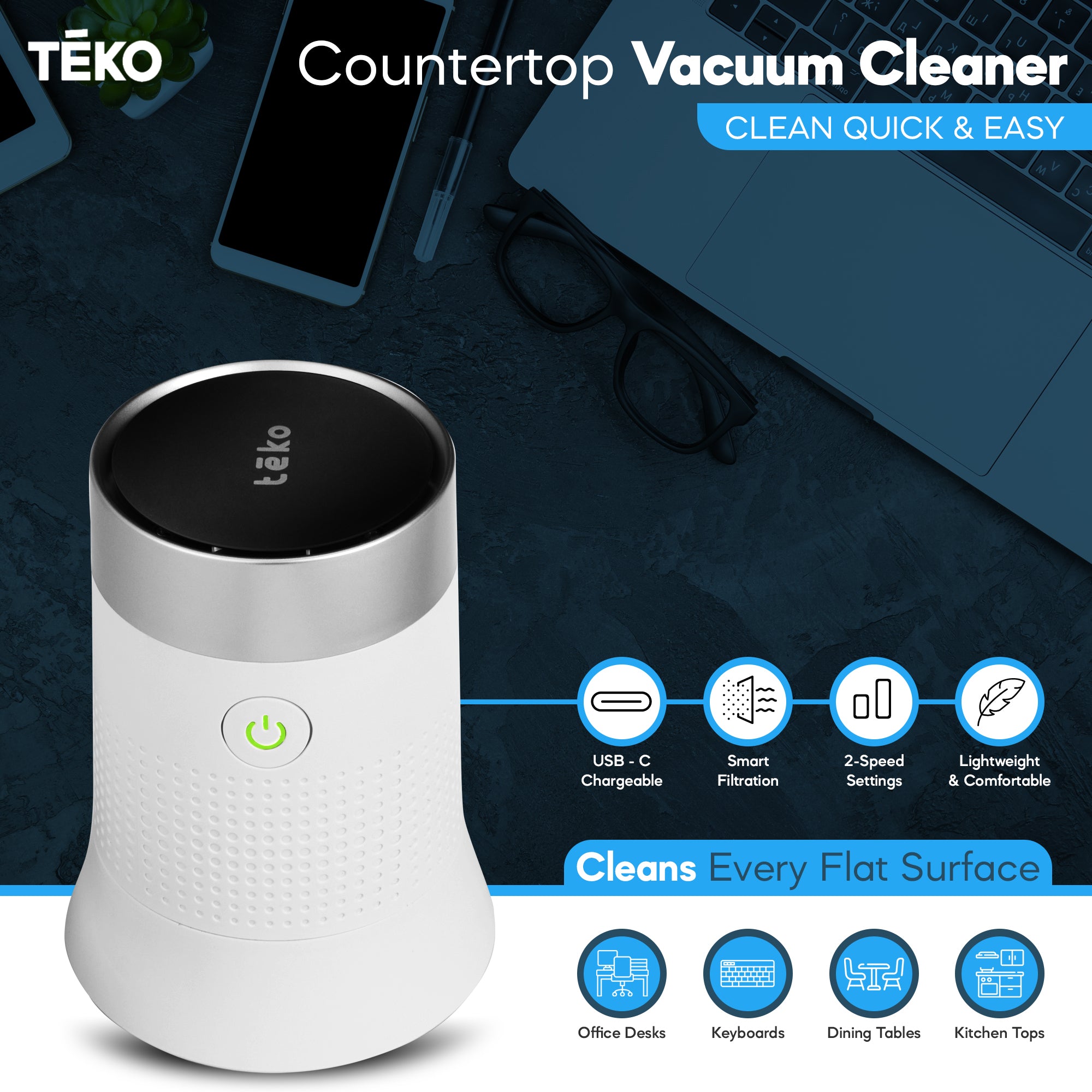- Powerful and fast - vacuums kitchen countertops, office desks, keyboards, dining tables, craft tables, garage work tables, make-up counters, and other flat surfaces quickly and easily.